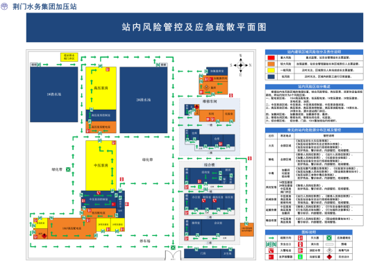 加壓站在站內(nèi)全面推行安全風(fēng)險(xiǎn)分級管控和隱患排查治理雙重預(yù)防機(jī)制,對作業(yè)現(xiàn)場可能存在的安全風(fēng)險(xiǎn)進(jìn)行全面識別、評估和分級,同時(shí)制作風(fēng)險(xiǎn)四色圖和風(fēng)險(xiǎn)告知牌,將安全風(fēng)險(xiǎn)等級從高到低按區(qū)域依次劃分為重大、較大、一般和低風(fēng)險(xiǎn),分別用紅、橙、黃、藍(lán)四種顏色標(biāo)示,明確不同區(qū)域的風(fēng)險(xiǎn)等級、防范措施和相關(guān)責(zé)任人,以最直觀的方式展示作業(yè)現(xiàn)場的安全風(fēng)險(xiǎn)及防范措施。根據(jù)風(fēng)險(xiǎn)四色圖和風(fēng)險(xiǎn)告知牌外來人員能了解所處區(qū)域可能存在的風(fēng)險(xiǎn),做好自身防護(hù),施工人員則可以做好施工前的風(fēng)險(xiǎn)管控,降低作業(yè)過程中的安全風(fēng)險(xiǎn)。