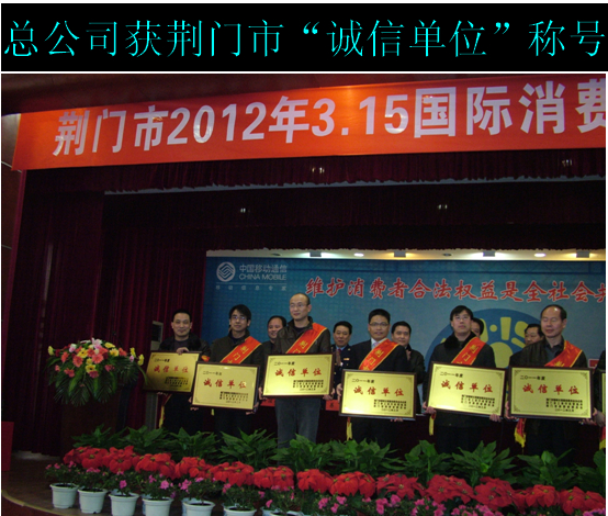 3.15國(guó)際消費(fèi)日前夕,在荊門市開展的“萬(wàn)名消費(fèi)者評(píng)誠(chéng)信”活動(dòng)中,經(jīng)過(guò)廣大消費(fèi)者投票評(píng)選,荊門市供水總公司被市文明委、市工商行政管理局、市消委聯(lián)合授予“誠(chéng)信單位”,并取得第三名的好成績(jī)。圖為黨委書記陳永根在表彰會(huì)上接受牌匾。