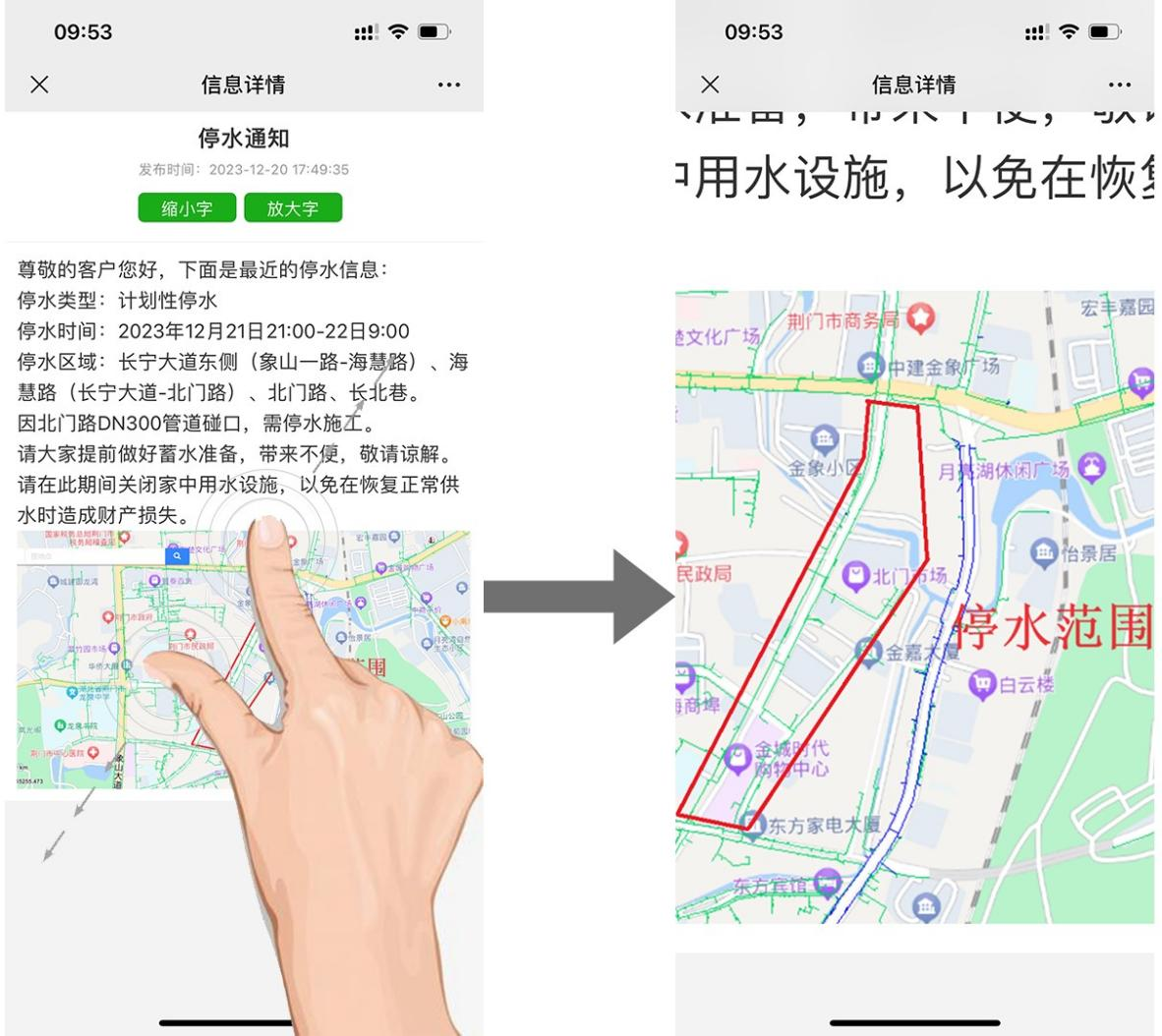 最新停水通知發(fā)出后,用戶通過(guò)【查看詳情】,點(diǎn)擊綠色【放大字】按鈕,可清晰查看停水類型、停水時(shí)間和停水區(qū)域。