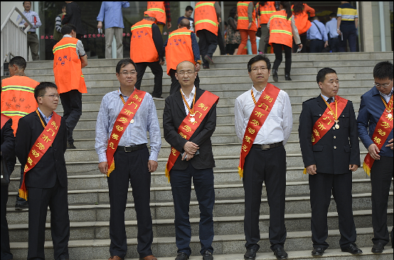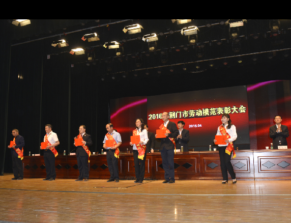 荊門市勞動模范、供水總公司黨委書記、總經(jīng)理陳永根(右二)上臺接受頒獎。