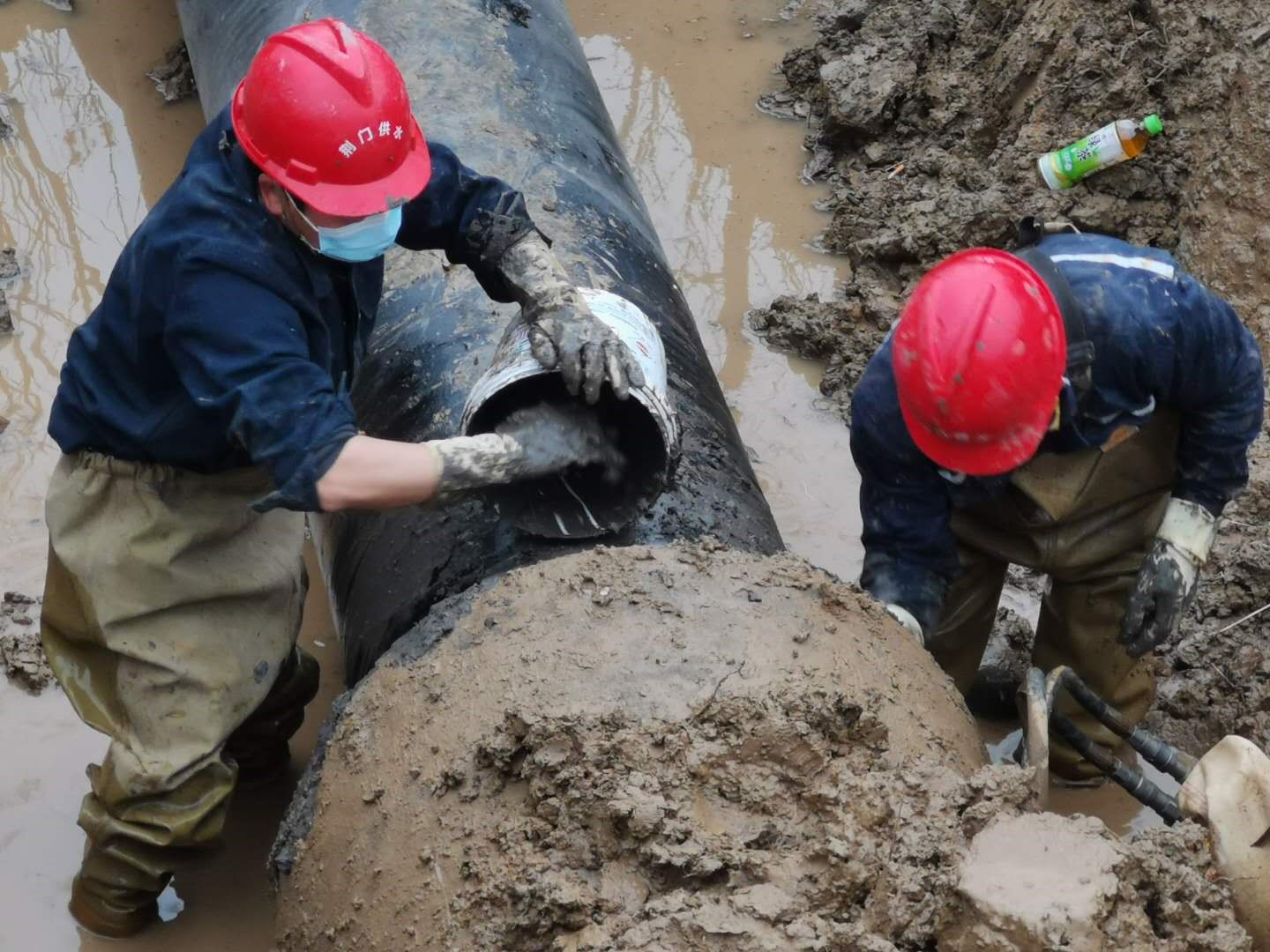 2月23日10時,掇刀區(qū)迎春大道人福藥業(yè)門前DN600mm主供水管道突發(fā)爆管,供水維修部門迅速啟動疫情期間應急搶修預案,組織人員、工程機械、維修設備趕赴現(xiàn)場,經(jīng)過9個多小時的緊張搶修,于當日晚7點42分恢復了供水。緊接著次日8點,東寶區(qū)科陽路DN600mm主供水管道突發(fā)爆管,巡查人員現(xiàn)場核實后迅速止水,并及時通告用戶停水信息后開始倒閘排水,到13時左右開挖出爆管的DN600的主供水管道出現(xiàn)在大家面前,相比前日的搶修,整段水管因裂口較大損壞嚴重,不能簡單修復,只能現(xiàn)場立即制定可靠的管道更換維修方案。當時,全部工作人員從早上到現(xiàn)場已經(jīng)工作了5個小時,滴水未進,但大家為保障搶修進度,仍然堅持一邊加班加點對基坑進行處理,一鼓作氣將破損管道清理出來,做好對接管道的清淤工作。另一邊搬運快干水泥,切割、加工、運輸、吊裝管道,14點35分把全部材料物資運抵現(xiàn)場開始作業(yè)。隨后,大家在泥地里匆匆啃了幾口方便面后,又投入到緊張的搶修工作中,終于在18點17分完成了維修,待水泥養(yǎng)護好后,于21點27分通水,及時保障了科陽路企業(yè)和周邊居民的正常生產(chǎn)生活用水。