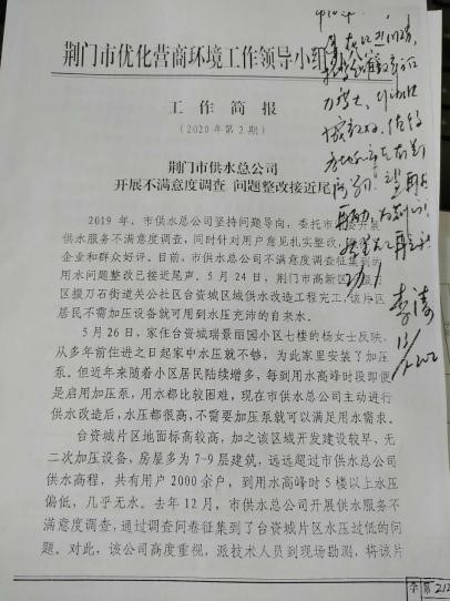 7月13日,市委副書記、市委政法委書記李濤在市優(yōu)化辦第2期工作簡(jiǎn)報(bào)專文《荊門市供水總公司開展不滿意度調(diào)查 問(wèn)題整改接近尾聲》上作出批示,指出“市供水總公司在改進(jìn)服務(wù)、提高工作效率方面力度大、行動(dòng)快、成效好,值得各地和市直有關(guān)部門學(xué)習(xí),望再接再厲,為荊門高質(zhì)量發(fā)展再立新功”,對(duì)公司優(yōu)化供水服務(wù)工作給予高度評(píng)價(jià)和充分肯定。